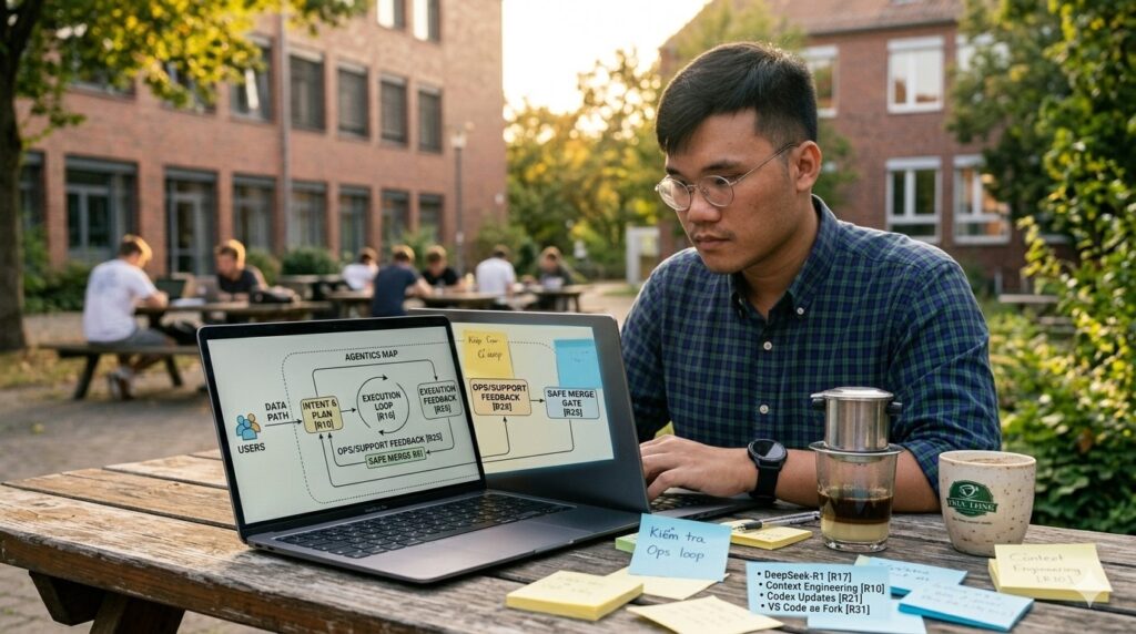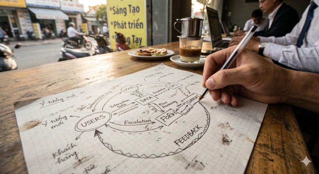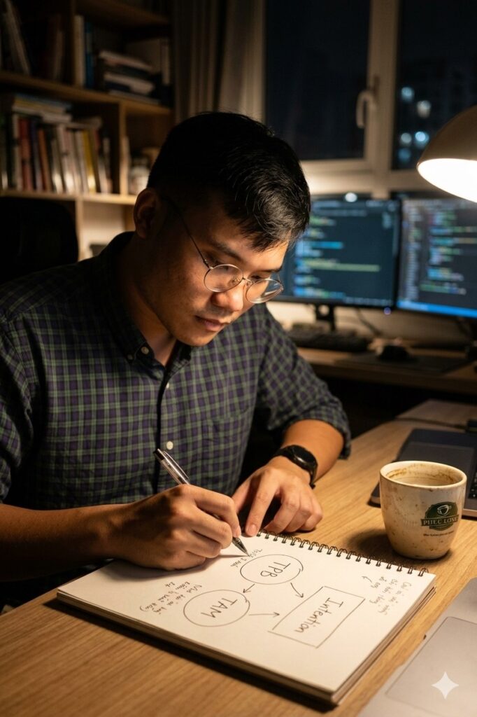 Image Prompt: A Vietnamese solo builder drawing two circles labeled “TPB” and “TAM” on a notebook, arrows flowing into “Intention,” coffee cup beside, cozy night desk light, realistic documentary style.